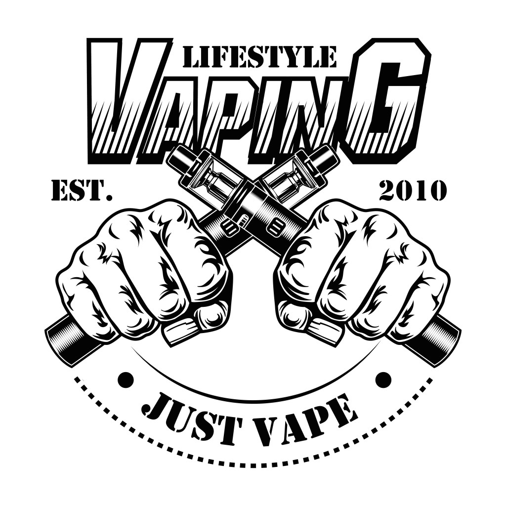 E-cigarettes vector illustration. Male human hands holding crossed electronic cigarettes, lifestyle text. Retail concept for vape bar or store label, poster or emblem template