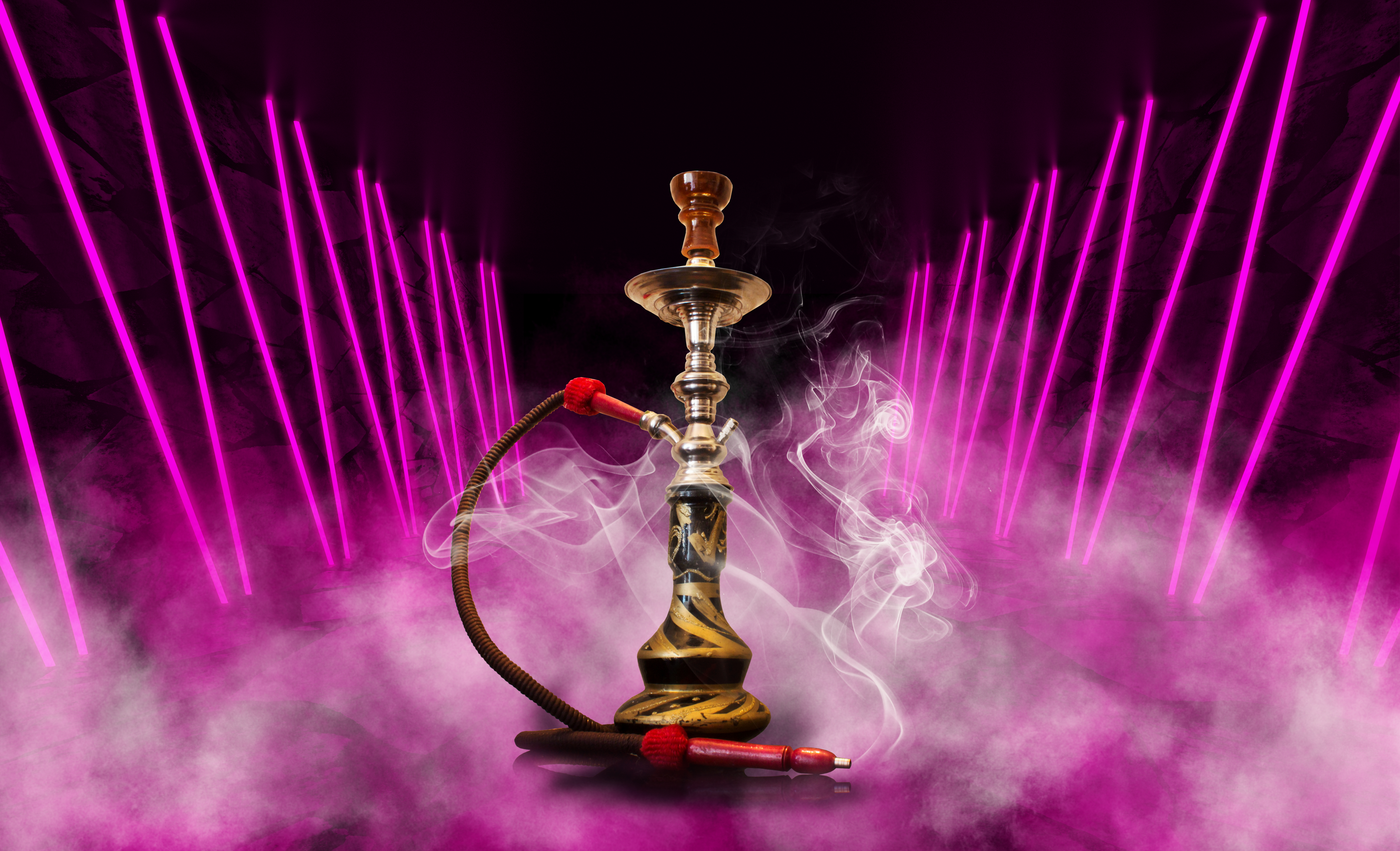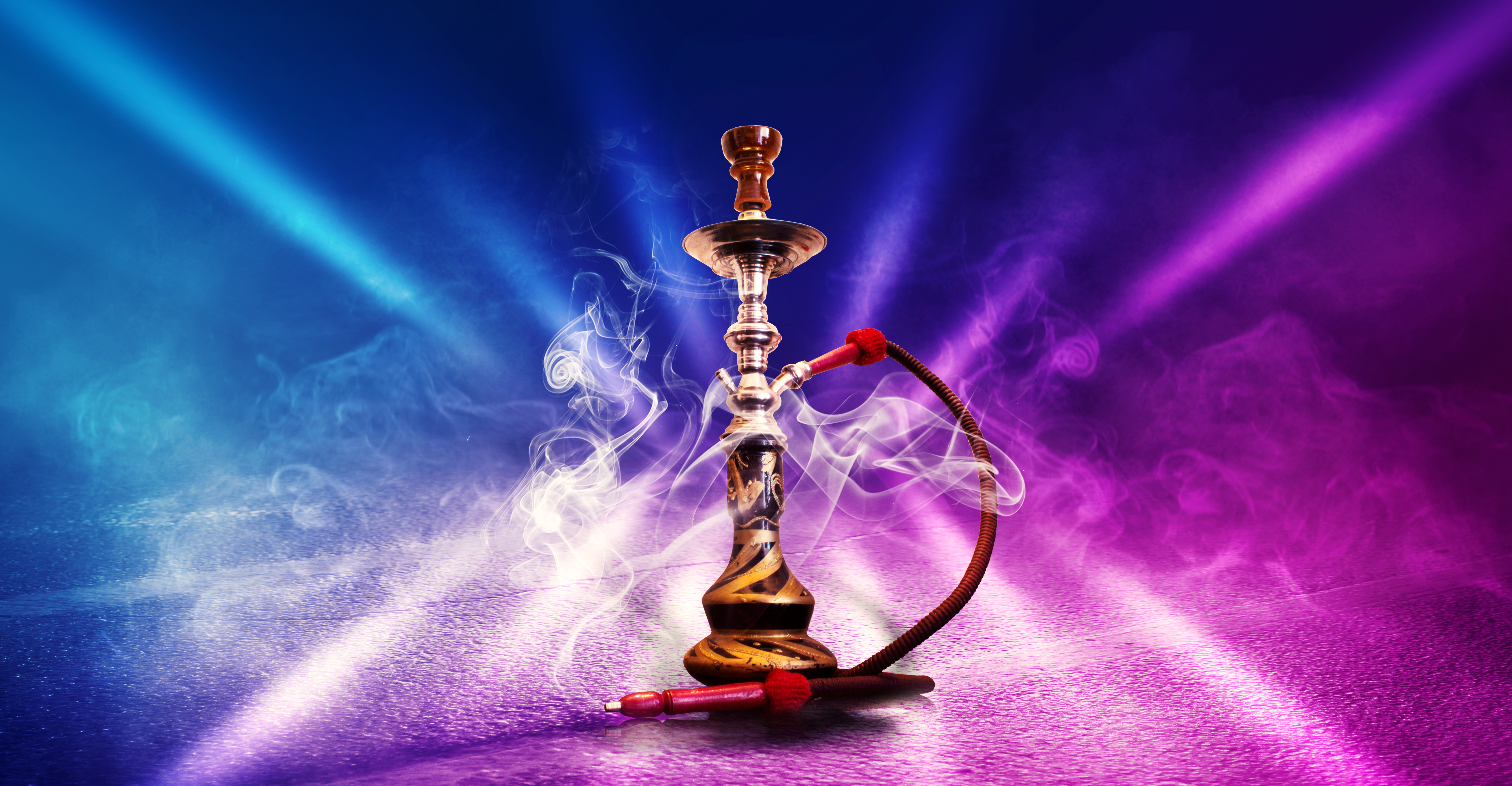 Modern hookah, shisha on a smoky black background with colored lighting and smoke. Close-up and place for your text